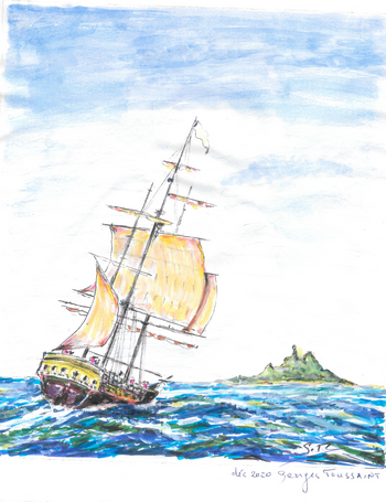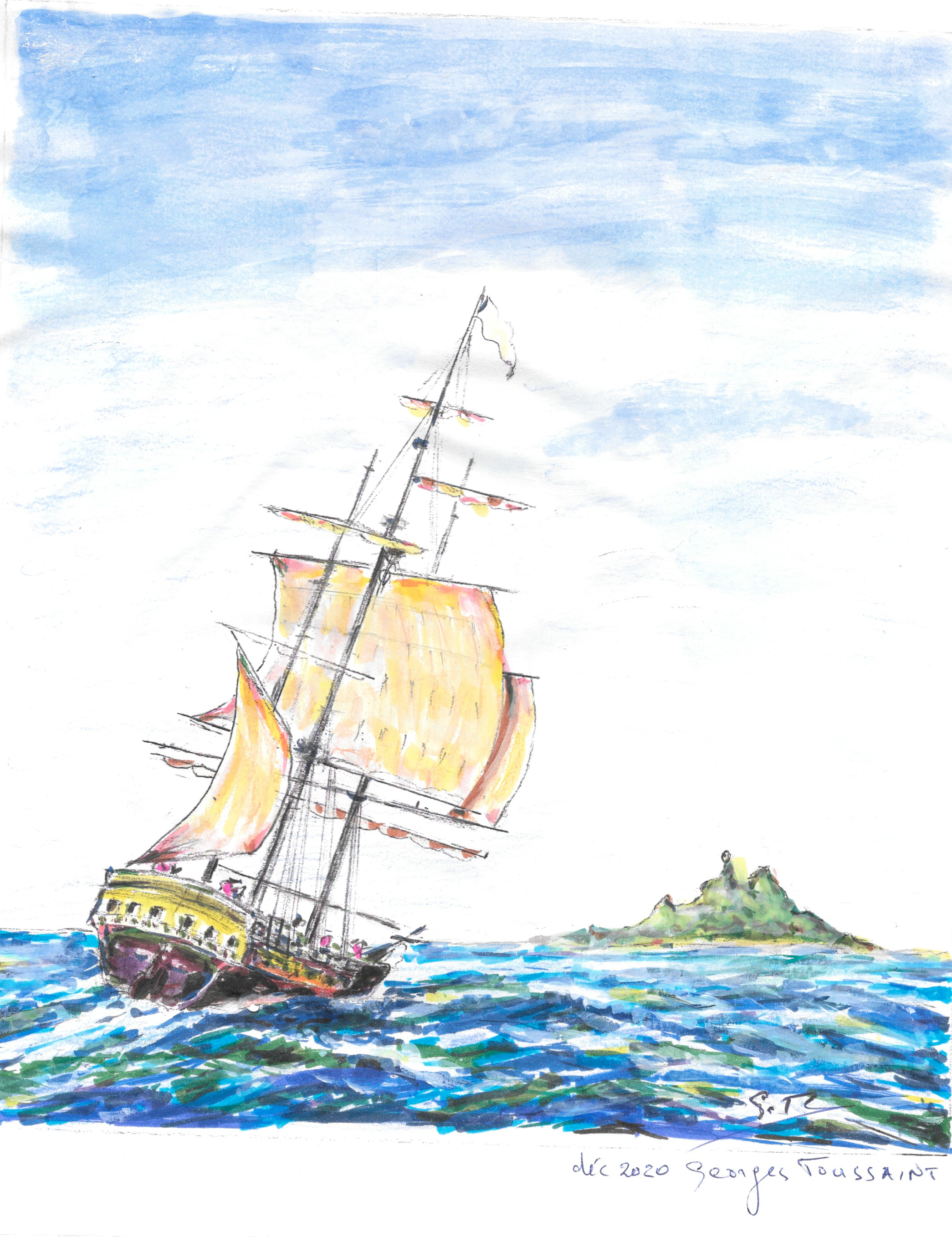 Une frégate sur le modèle de l’Hermione, s’approche de l’Ile Maurice, ancienne Isle de France. Dessin exécuté par Georges Toussaint.